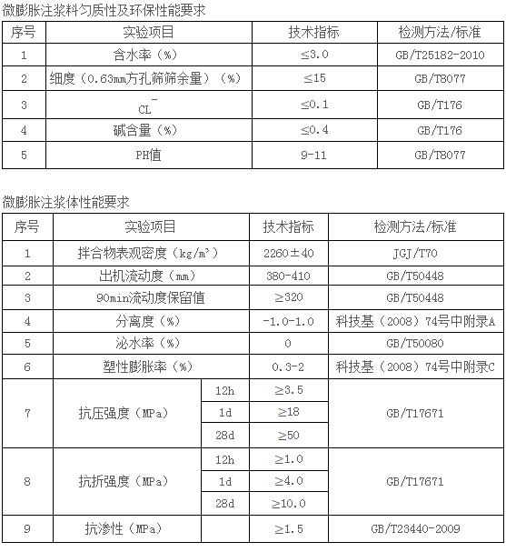 微膨脹注漿料由普通硅酸鹽水泥、摻和料、聚羧酸減水劑、微膨脹劑、硅砂等為主要成分,經均勻復合而成的,具有微膨脹性能,良好的流動性和泵送性,與襯砌混凝土具有良好的結合性能,通過高壓注漿泵注入到隧道襯砌與防水板間的脫空區的一種注漿材料。