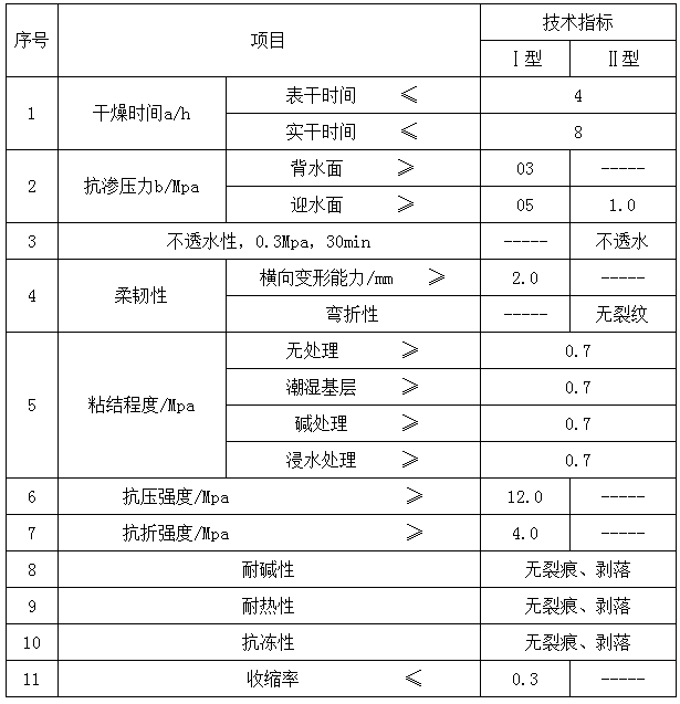 聚合物水泥防水漿料,其性能是一種界于聚合物水泥防水涂料(柔性)和聚合物水泥防水砂漿(剛性)之間,又不同于聚合物水泥防水涂料(柔性)和聚合物水泥防水砂漿(剛性)這兩種產品的新型防水材料。該漿料兼有剛性與柔性結合的特性,漿料聚合物的涂膜具有延伸性、防水性,又具有水硬性材料強度高、易與潮濕基層粘結和耐水性好的優點或根據不同工程部位要求調節柔韌性和強度等性能,施工方法靈活方便。在近年的發展過程中,以其較高的特性在不同的建筑業領域中,用作屋面、外墻、衛生間、地下室、鐵道、隧道、水利、水工等方面得到迅速發展和廣泛應用。