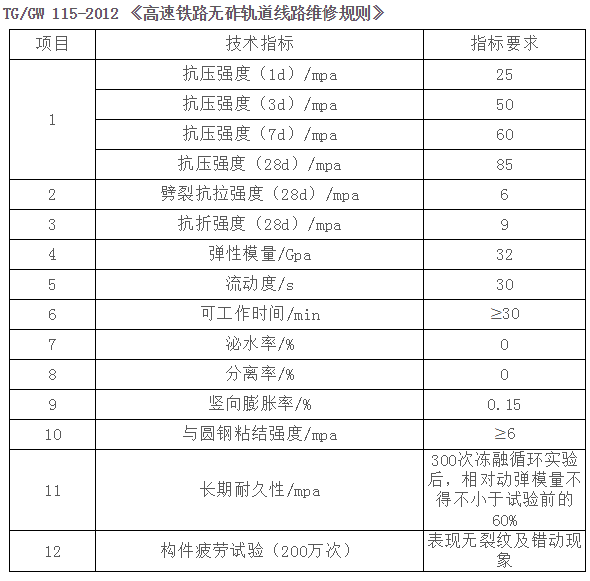 4、灌注過程:①攪拌:CGM-5砂漿的推薦配合比為水:料=19%,根據(jù)設(shè)計所需要的流動度可適當(dāng)調(diào)節(jié)用水量,配合比范圍水料比18-20%,攪拌時間為3-5min。②灌注:將輸漿管接到道床板的灌漿孔上,直接進行灌注;并觀察模板上的排氣孔。當(dāng)有漿體稠度與注入的稠度相同時,即可將排氣孔堵住,完成灌注。③清洗:每班澆筑完畢后,清洗攪拌機、輸漿管以及粘附有砂漿的工具。④拆模和養(yǎng)護:按一般的方法即可